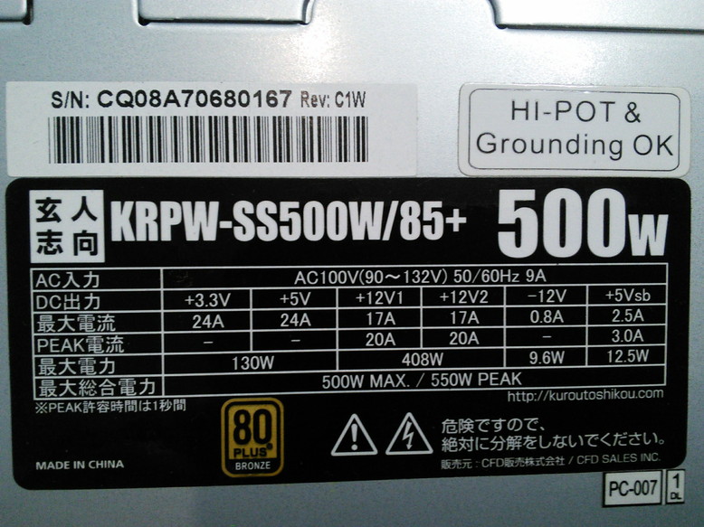 型番:KRPW-SS500W/85+